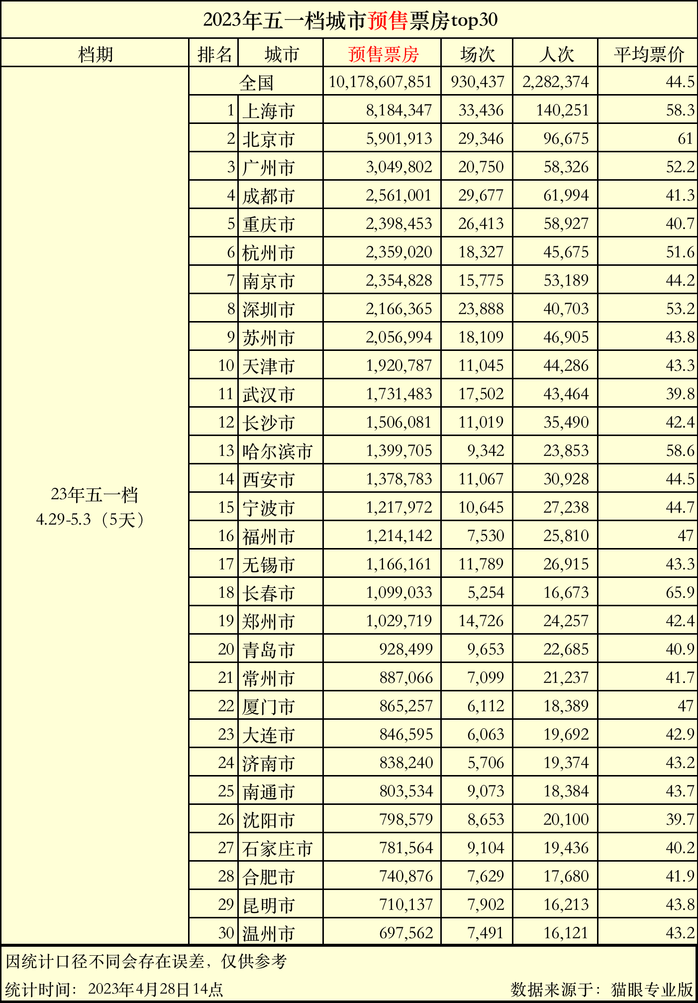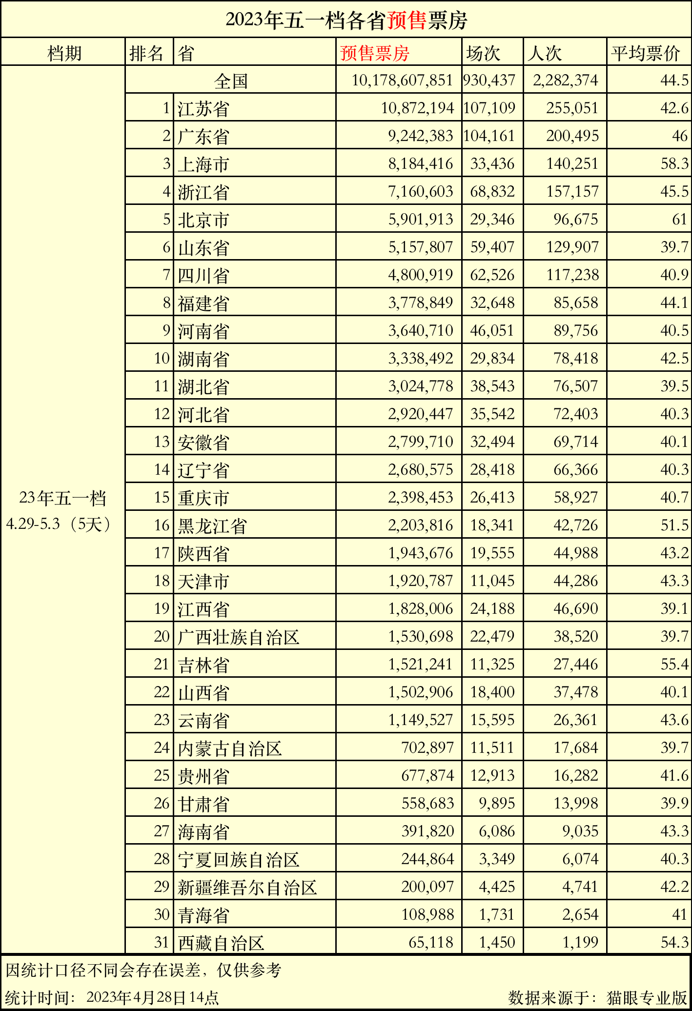 其中,江蘇省、廣東省、上海市分別以1017萬、924萬、818萬元的預售票房名列2023年五一檔各省預售票房前三,上海市、北京市、廣州市分別以818萬、590萬、304萬的預售票房名列2023年五一檔各市預售票房前三。