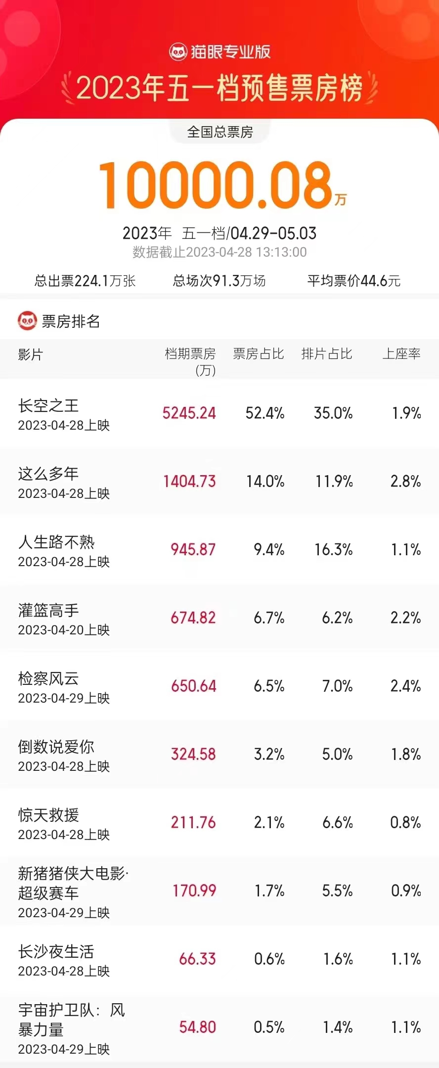 中國網北京4月28日訊 (記者 秦金月)五一假期將至,電影市場即將迎來新一輪觀影熱潮。據貓眼專業版數據顯示,共有包括《長空之王》、《這么多年》、《人生路不熟》在內的18部新片定檔,影片數量創歷史同檔期新高。截止2023年4月28日13點13分,2023年五一檔新片預售票房已突破1億。