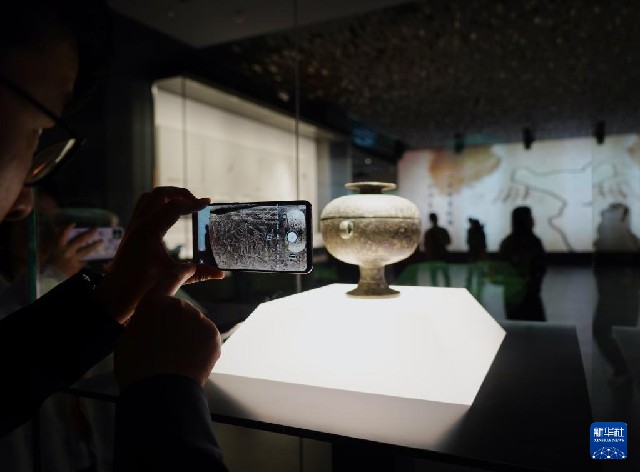 4月27日,參觀者在羅家壩遺址博物館拍攝展出的水陸攻戰紋銅豆。
