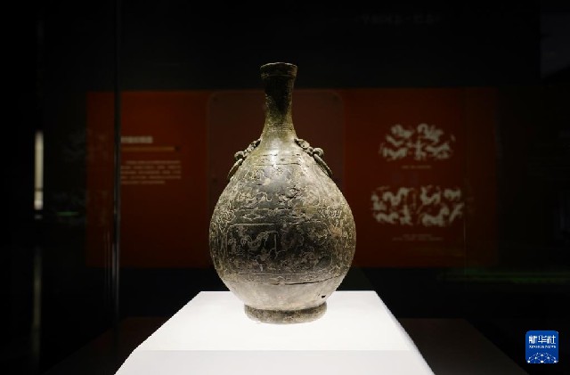 這是4月27日在羅家壩遺址博物館拍攝的狩獵紋銅壺。