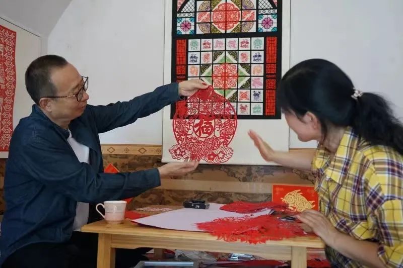 潘魯生與陜北剪紙藝人董林美討論剪紙創作 2019年
