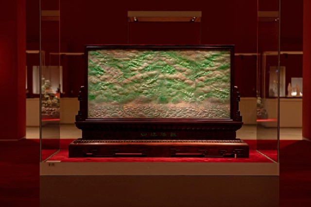 展廳前方,四件國寶級翡翠珍品《岱岳奇觀》《含香聚瑞》《群芳攬勝》《四海騰歡》美輪美奐。還有牙雕、玉雕、骨雕、貝雕、漆器、金屬工藝、織染繡、陶瓷、竹木工藝等,品類繁盛、匠心畢現。