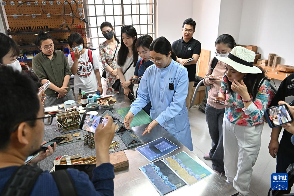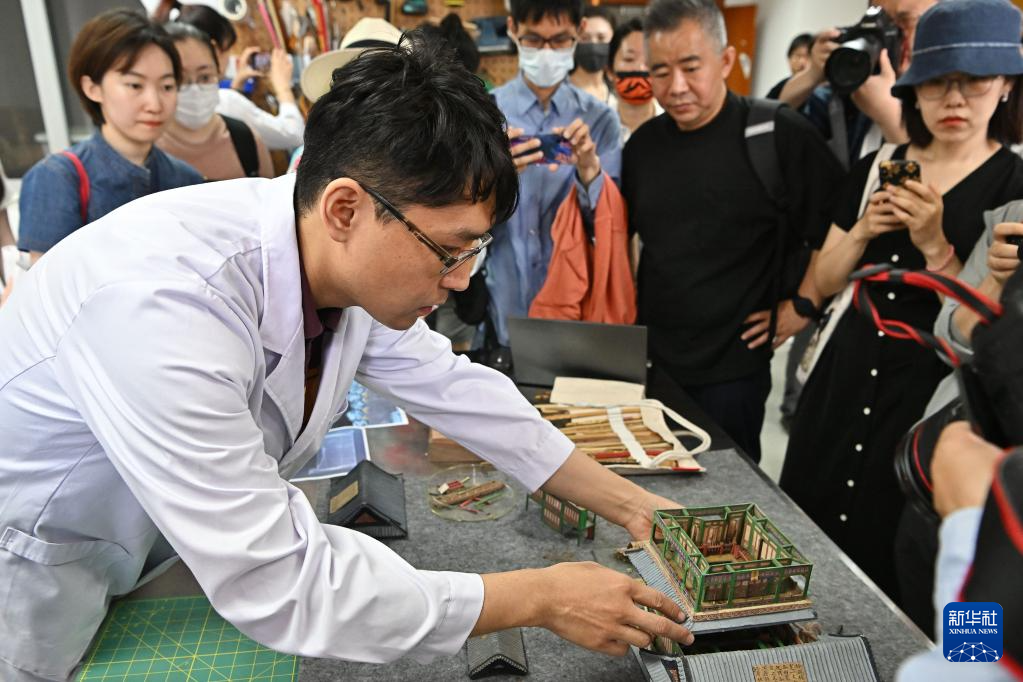 5月16日,國博文保院修復師楊琴(著藍色工作服者)向媒體記者介紹通過科學檢測手段分析研究圓明園同樂園建筑群樣式雷燙樣文物材質、構造等內容。
