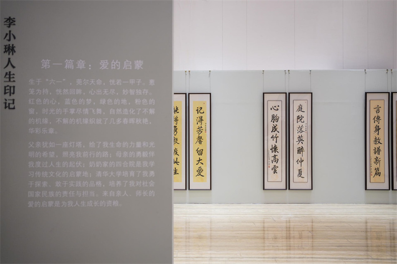 《甲子抒懷——詩琳畫卷》畫展,共分《愛的啟蒙》《愛的奉獻》《愛的滋養》《愛的心愿》《愛的品格》五大主題,集中展出了李小琳的書法、繪畫等百余幅作品。書法作品以18字楹聯的形式,講述一段人生故事,60副楹聯,組成了人生一甲子的傳記故事。其中,《愛的品格》主題,是李小琳以歷代文人墨客鐘愛的“梅蘭竹菊蓮丹心”為主題創作的詩書畫作品。梅蘭竹菊被人稱為“四君子”,而蓮花、牡丹更是有著出淤泥而不染和高貴優雅的品性。她們的傲、幽、堅、淡、潔、雅是中國人感物喻志的象征,也是詠物詩和文人畫中最常見的題材,正是根源于對這種審美人格境界的神往,李小琳將之作為自己創作的題材,將梅之堅毅、蘭之賢達、竹之空靈、菊之隱逸、蓮之高潔、牡丹之典雅,這些象征著人世間最美好、最高潔的品格,以詩書畫形式呈現出來。這些作品將收錄于《詩琳畫卷》下卷,此次展出也將作為下卷的鋪墊和熱身。