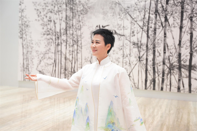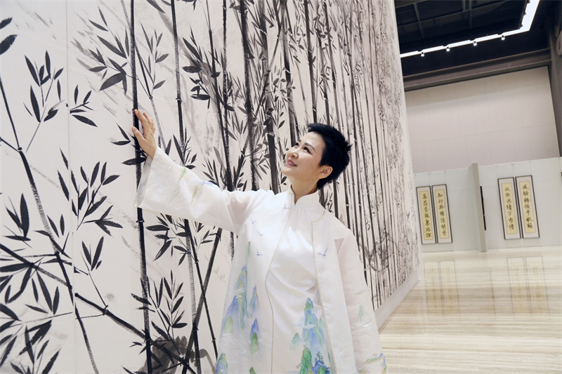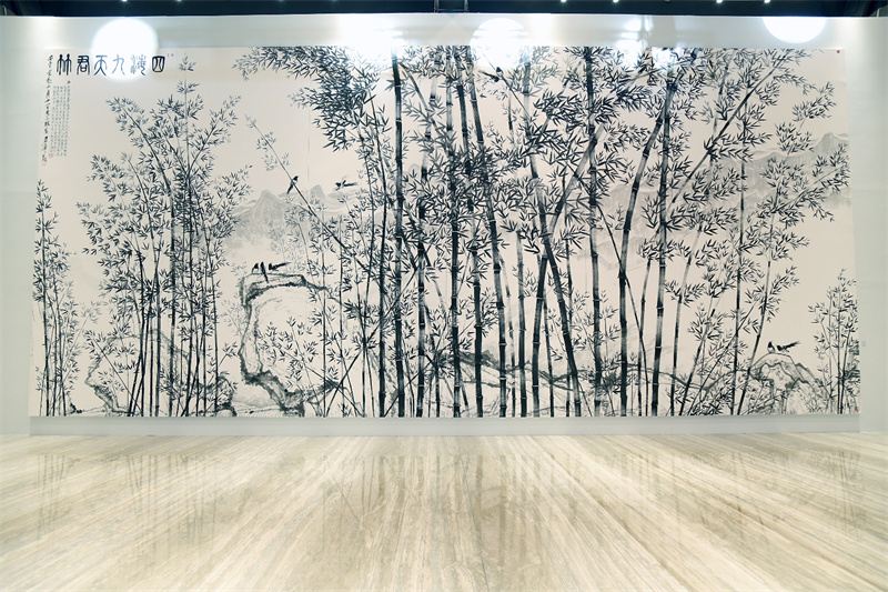 李小琳在詩書畫方面極具天賦,并觸類旁通,將所思所感自然而然地融入作品當中。此次展出的楹聯作品均為八尺四裁豎幅大作,通天緯地、字闊如斗,用墨厚重扎實,章法穩定。六幅丈八尺宣組成(近820平尺)的水墨畫《九天君竹》,是她迄今創作的最大尺幅的竹林圖。李小琳所畫之竹富有靈性和智慧,整幅畫作氣韻生動,形神兼備之余更具磅礴之勢,畫面錯落有致,濃淡得宜,竹子枝干遒勁、堅韌挺拔,可見其修身修意德行之深厚。