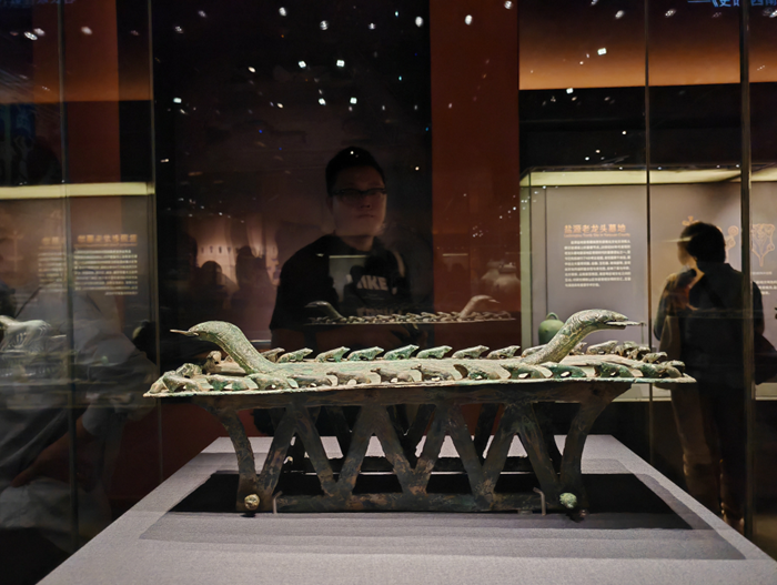 在成都金沙遺址博物館“吉金萬里——中國西南地區青銅文明展”展出的紡織場面銅貯貝器(局部)(5月26日攝)。新華社記者童芳攝