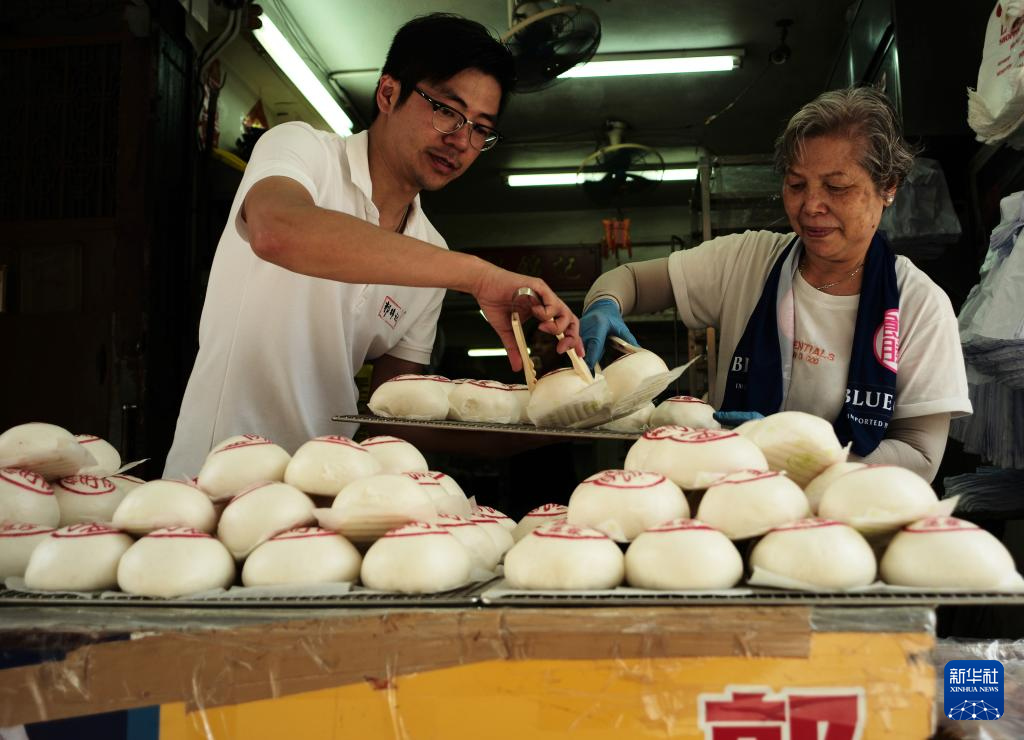 在香港的長洲島,郭錦記餅店第二代傳人郭宇鈿(左)擺放平安包(5月22日拍攝)。新華社記者 李鋼 攝