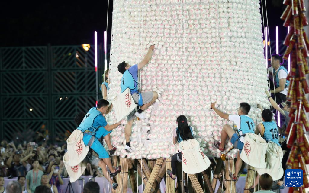 后來,傳統“搶包山”活動逐漸發展成為一項競技比賽,參賽者們奮力攀爬掛滿仿真包子的鋼架包山,爭搶印有“平安”二字的“包子”。雖然形式有所改變,但祈求平安的心意未曾改變。