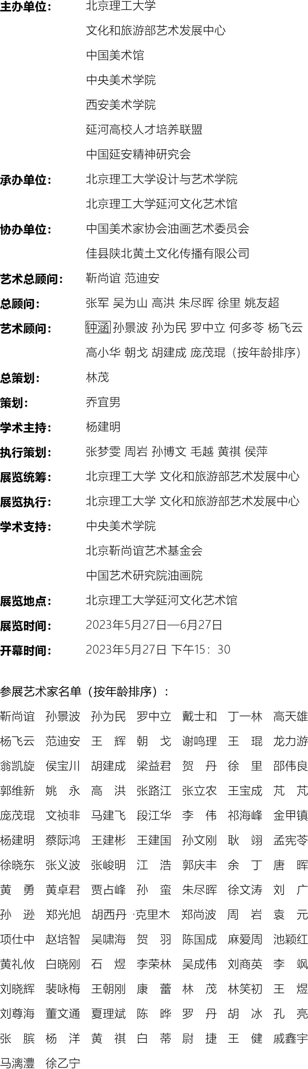 在深入開展學習貫徹習近平新時代中國特色社會主義思想主題教育之際,5月27日,由北京理工大學、文化和旅游部藝術發展中心、中國美術館、中央美術學院、西安美術學院、中國延安精神研究會和延河高校人才培養聯盟聯合主辦的“大力弘揚延安精神·向著新的奮斗目標出發——中國油畫名家筆下的延安”油畫寫生、創作藝術展在北京理工大學延河文化藝術館開幕。中國著名油畫家、教育家靳尚誼,北京市委教育工委分管日常工作的副書記張革,四川省科學技術廳黨組書記、廳長吳群剛,文化和旅游部藝術發展中心主任姚友超,中央美術學院黨委書記高洪,中央戲劇學院院長郝戎,中國農業大學黨委副書記王勇,北京外國語大學副校長趙剛,中央美術學院副院長林茂,中央民族大學副校長石亞洲,延安大學副校長呂達,北京理工大學校長龍騰院士,以及各高校相關部門負責人、參展藝術家代表出席開幕式。開幕式由北京理工大學黨委副書記、副校長龐思平主持。