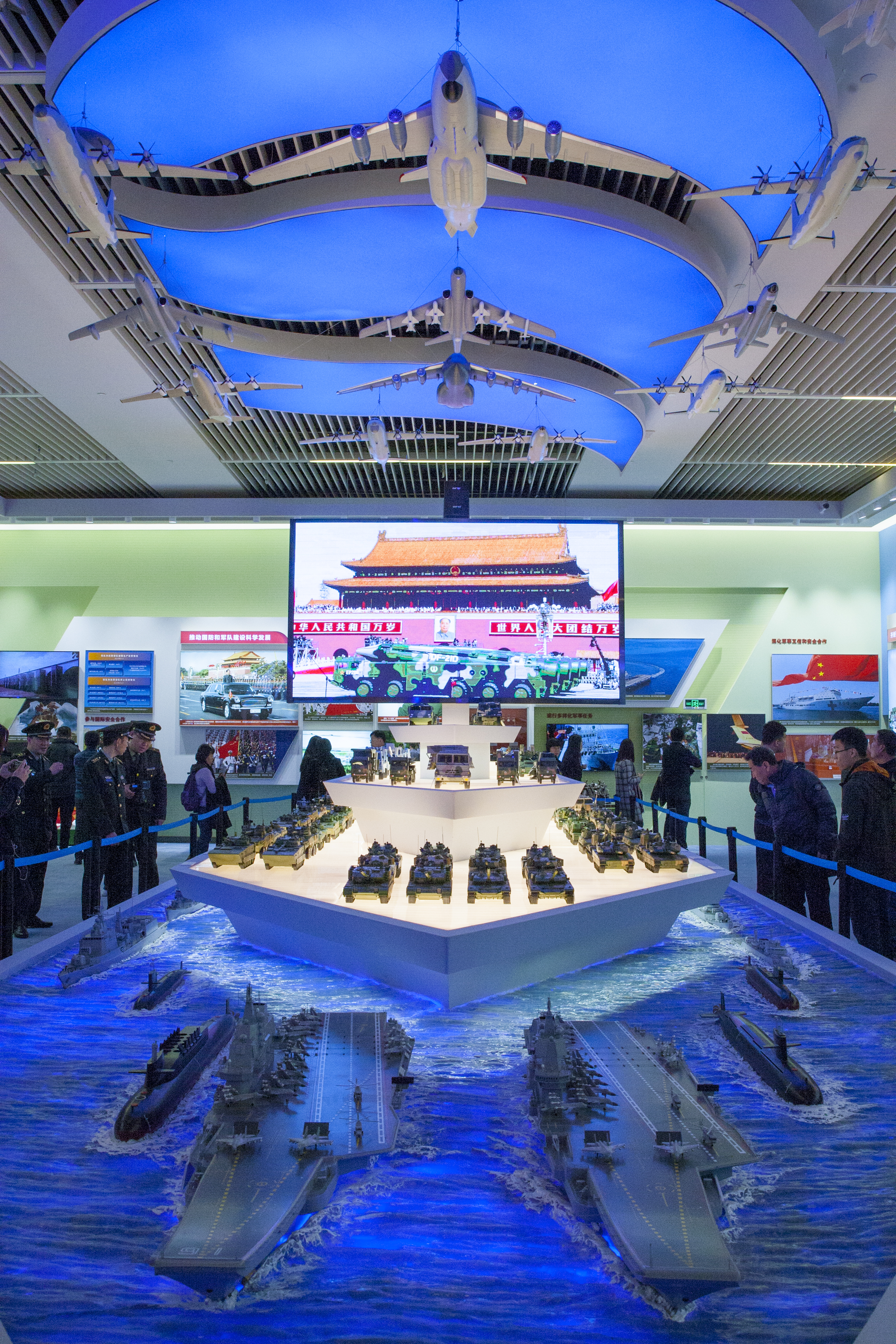 2018年11月16日,觀眾在國博“偉大的變革——慶祝改革開放40周年大型展覽”所設國防和軍隊建設專題展區內參觀航母編隊模型。攝影鄒毅/人民畫報