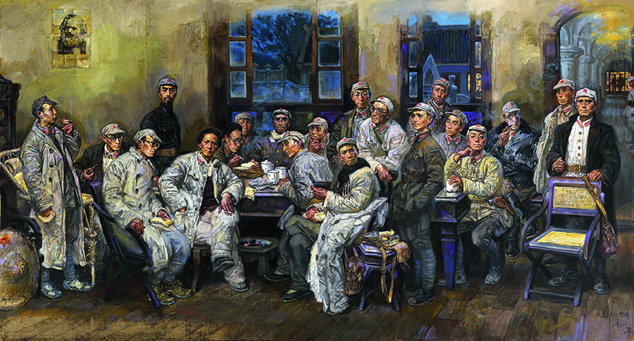 油畫《遵義會議》。1935年1月,黨中央在貴州遵義召開政治局擴大會議。遵義會議在紅軍第五次反“圍剿”失敗和長征初期嚴重受挫的歷史關頭召開,事實上確立了毛澤東在黨中央和紅軍的領導地位,開啟了黨獨立自主解決中國革命實際問題的階段,在最危急關頭挽救了黨、挽救了紅軍、挽救了中國革命。這幅作品描繪了遵義會議召開前的20位參會者。中國國家博物館供圖