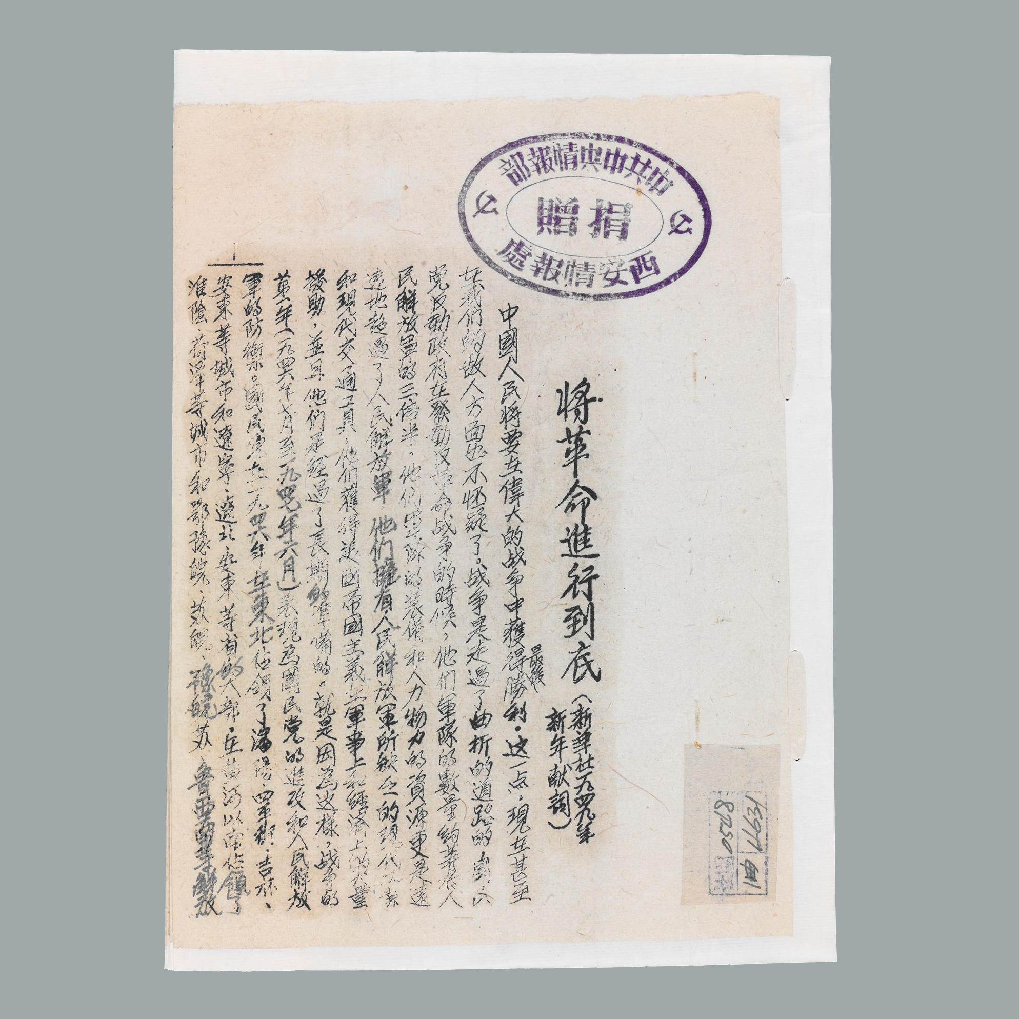 《將革命進行到底》。隨著解放戰爭的勝利發展,1949年元旦,蔣介石發表了要求和談的《新年文告》。對此,毛澤東為新華社寫了題為《將革命進行到底》的新年獻詞,號召全國人民、各民主黨派、各人民團體真誠合作,采取一致的步驟,粉碎美帝國主義和國民黨反動派的政治陰謀,將革命進行到底。中國國家博物館供圖
