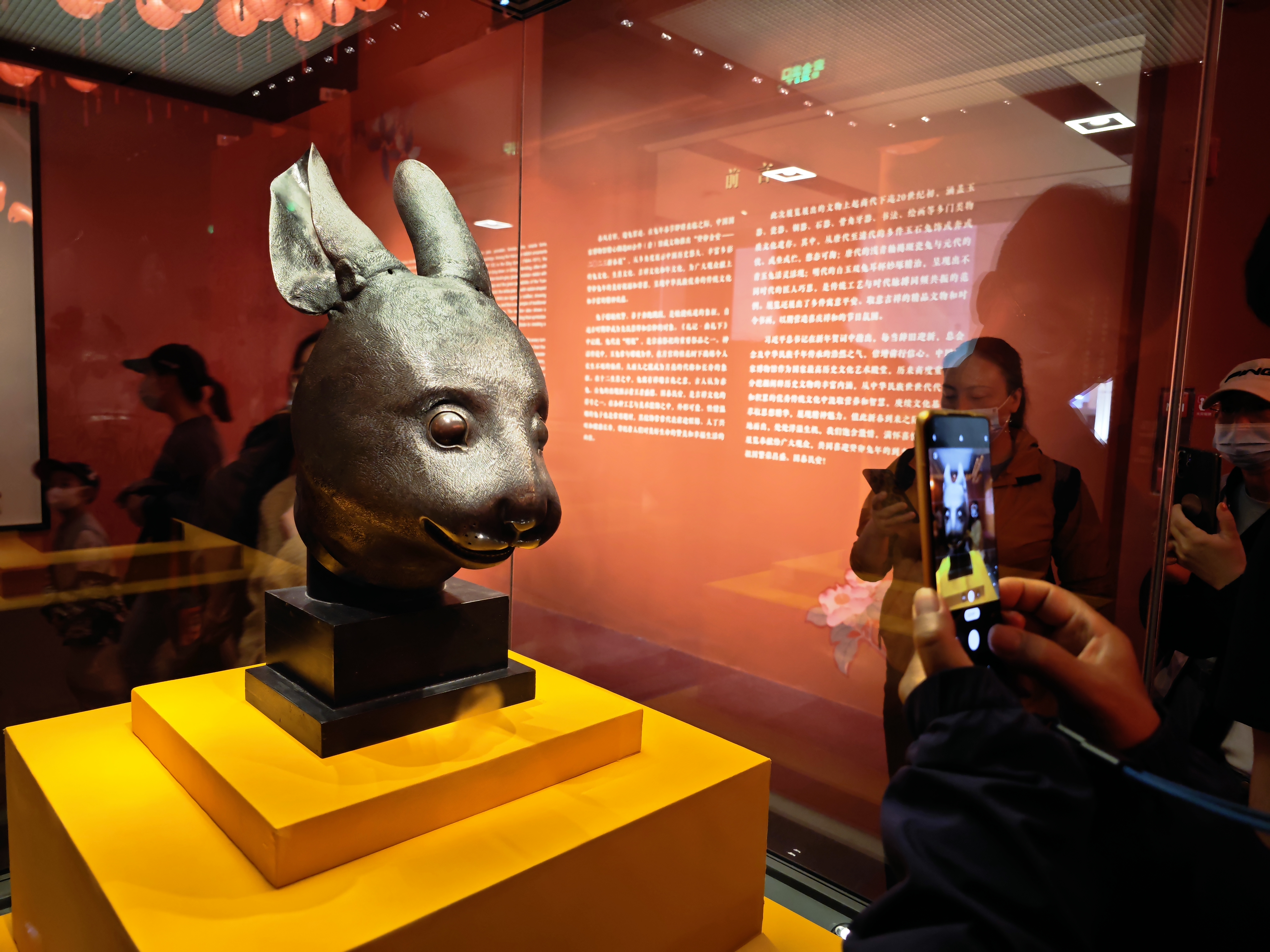 2023年5月6日,觀眾在觀賞圓明園青銅兔首。兔首銅像是圓明園西洋樓海晏堂十二生肖人身獸首銅像中的一個,為清乾隆年間意大利人郎世寧主持設計。以水報時的十二生肖銅像是海晏堂的精華。鴉片戰爭期間被英法聯軍掠奪并流失海外,2013年回歸。攝影萬全/人民畫報