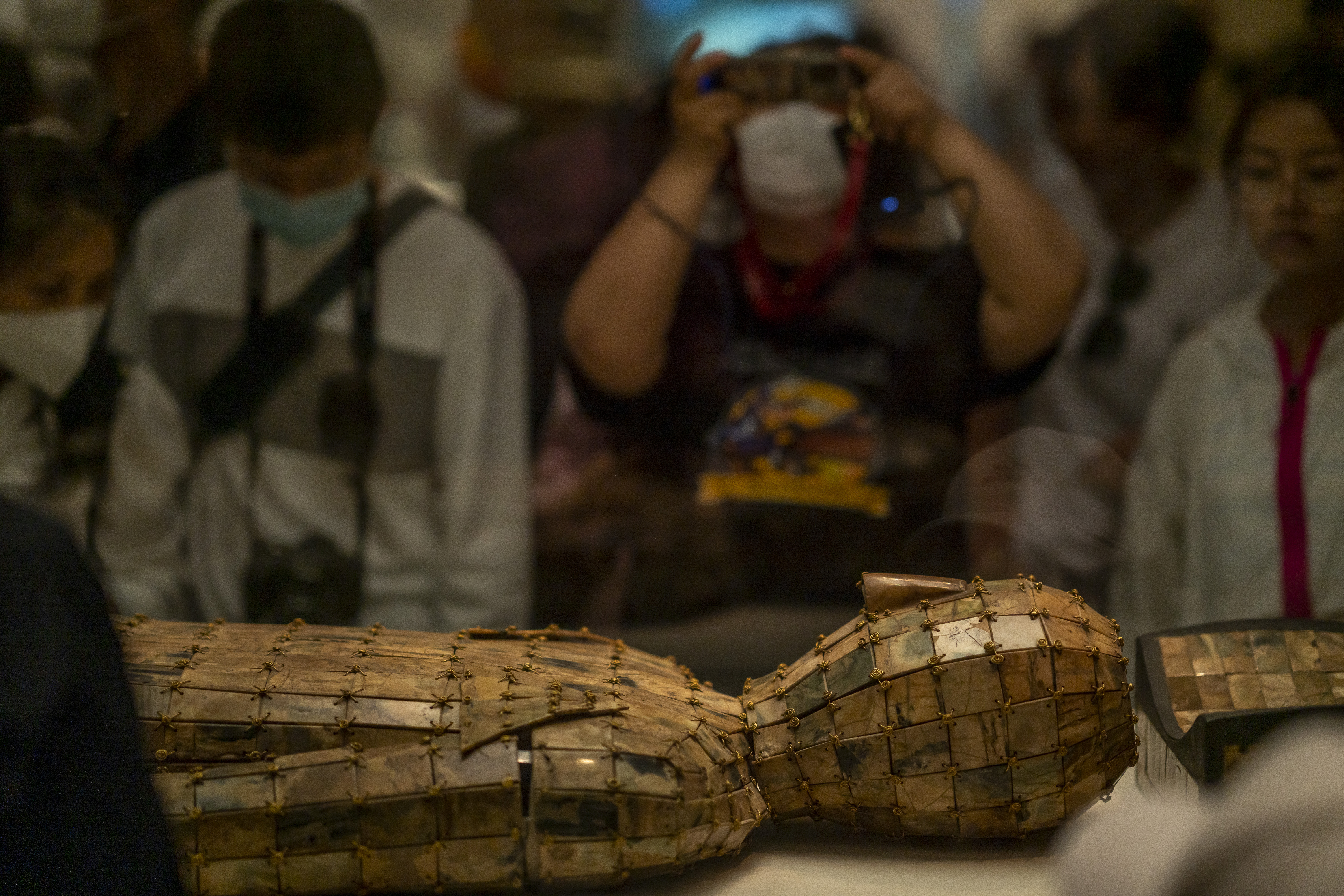 國博“古代中國”基本陳列,觀眾參觀金縷玉柙。金縷玉柙是西漢時期文物,長182厘米,1973年于河北定縣八角廊村40號漢墓出土。玉柙主人為中山懷王劉修,是著名的河北滿城漢墓墓主劉勝的后代。攝影郭莎莎/人民畫報