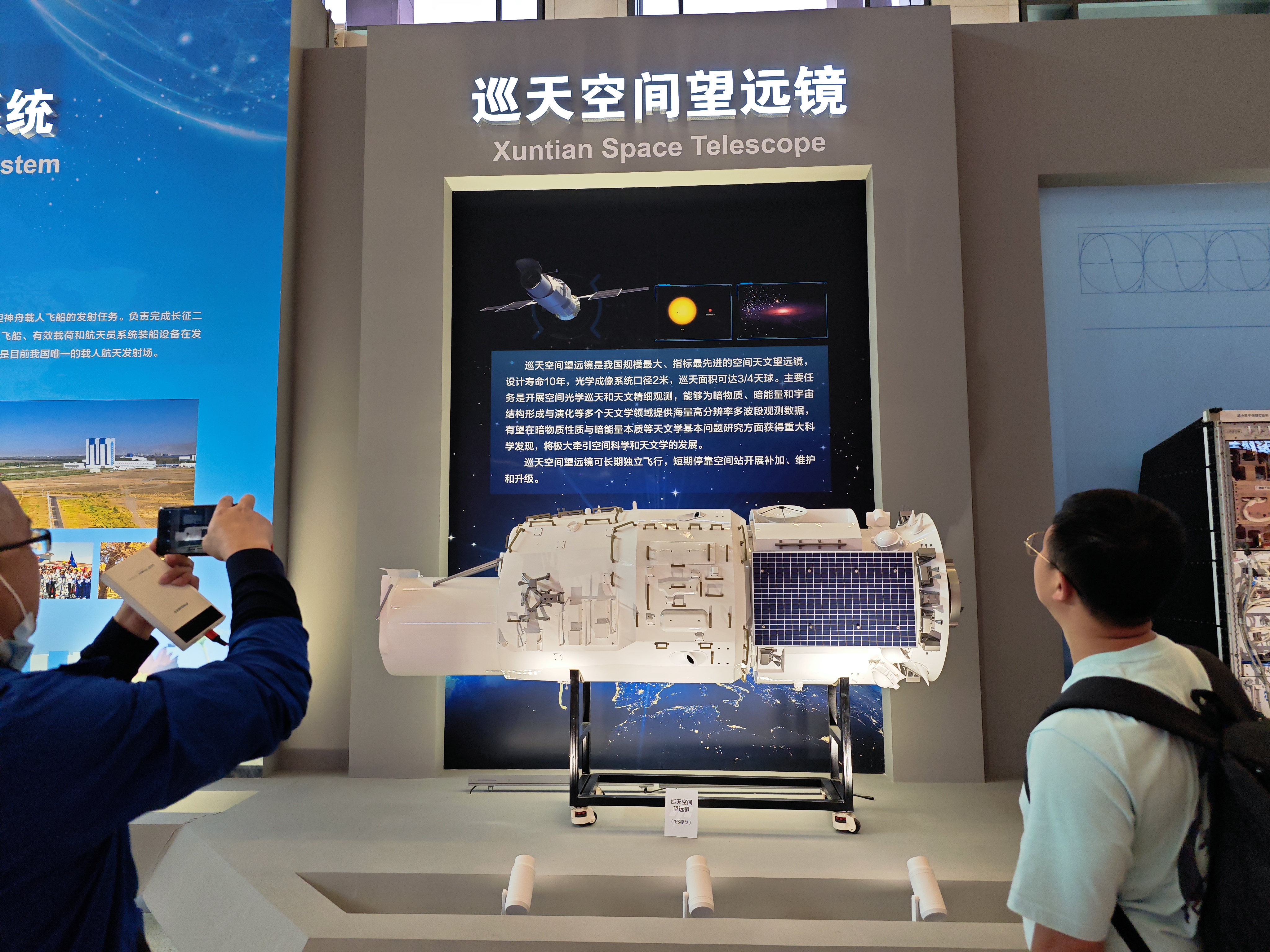 2023年5月6日,國博“逐夢寰宇問蒼穹——中國載人航天工程30年成就展”,觀眾參觀巡天空間望遠鏡1:5模型。攝影萬全/人民畫報