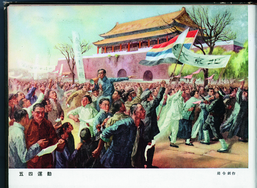 油畫《五四運動》。1919年5月4日,北京學生3000余人,高呼“外爭主權,內除國賊”的口號,在天安門前游行示威。反帝愛國的五四運動從此爆發。五四運動是近代中國革命史上具有劃時代意義的事件,標志著新民主主義革命的偉大開端。這幅作品呈現了五四運動中學生游行的場景。畫作中,城樓一角天空中的滾滾烏云象征著陰暗壓抑的社會環境和激蕩變幻的時代風云,而另一邊則藍天隱現,象征著希望的曙光。中國國家博物館供圖