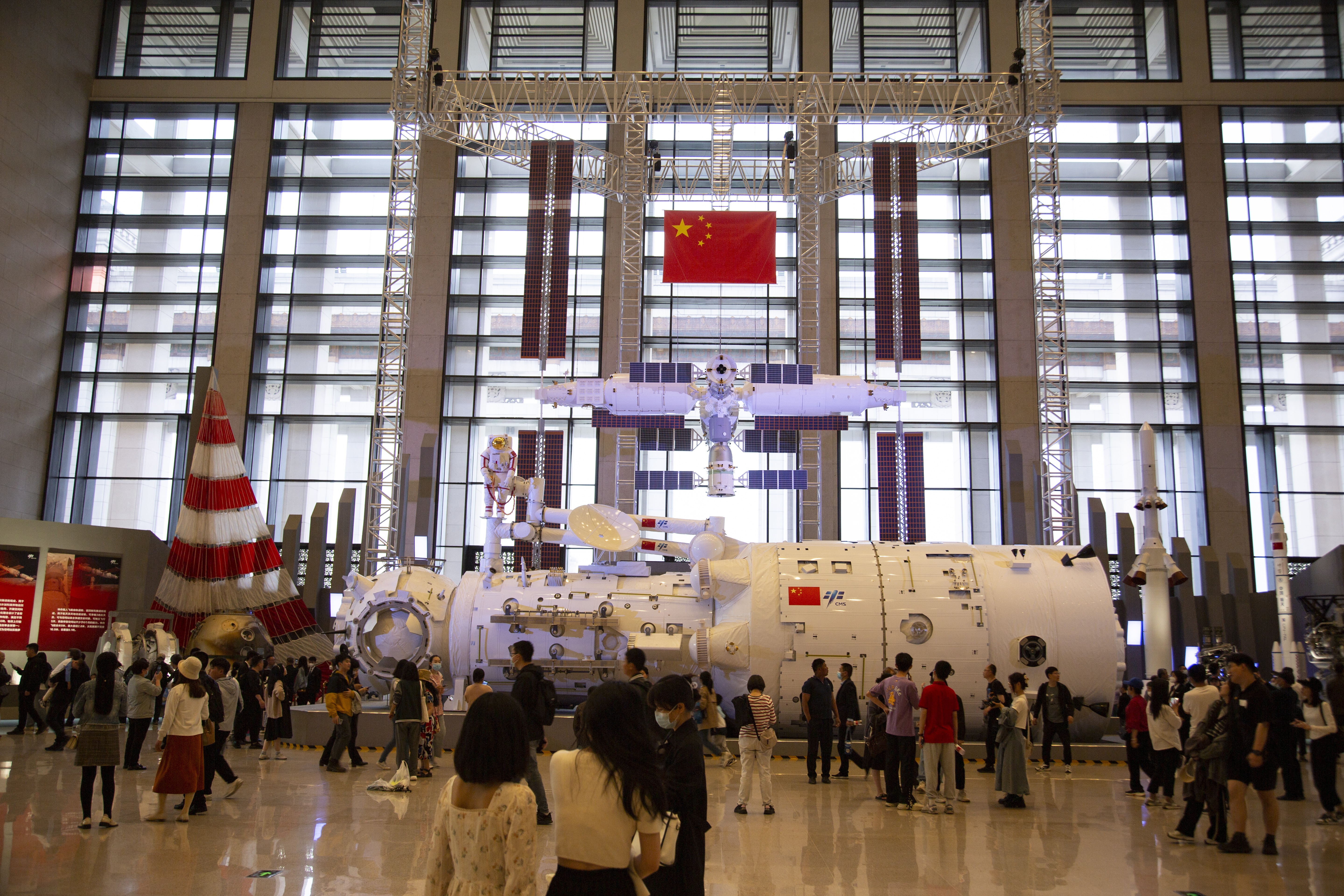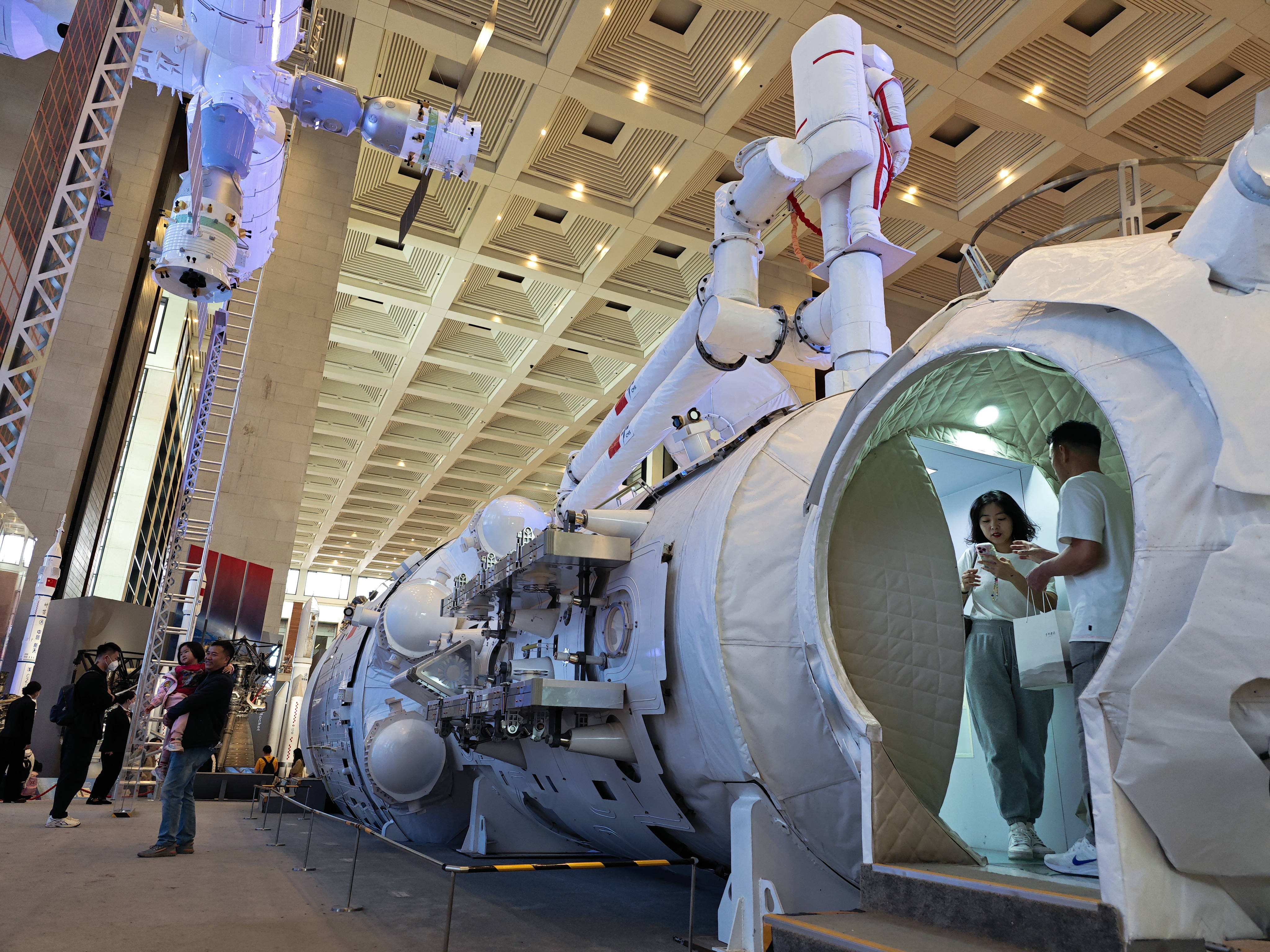 2023年5月9日,國博西大廳設立的“逐夢寰宇問蒼穹——中國載人航天工程30年成就展”中,可步入艙內參觀的天和核心艙1:1模型和空間站組合體1:4模型吸引了眾多觀眾。攝影董芳/人民畫報