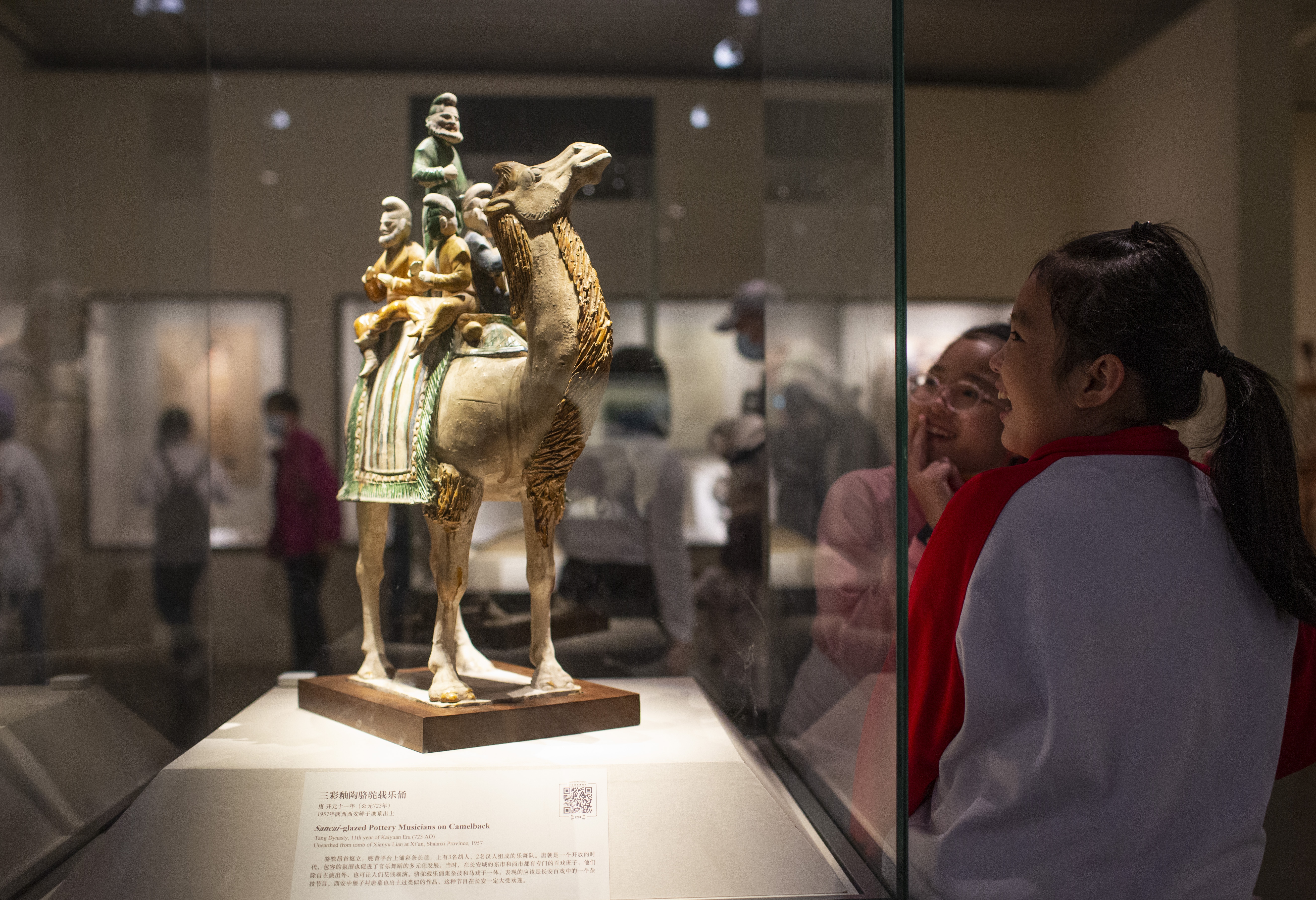 2023年5月6日,國博“古代中國”基本陳列,兩名小學生被三彩釉陶載樂駱駝吸引。載樂駱駝陶俑表現的應該是長安百戲中的一個雜技節目。這件載樂駱駝陶俑巧妙地夸張了人與駱駝的比例,造型優美生動,釉色鮮明潤澤,代表了唐三彩的最高水平。它既是唐代文化藝術、制作工藝發達昌盛的重要物證,也見證了絲綢之路上藝術的交流與融合。攝影秦斌/人民畫報