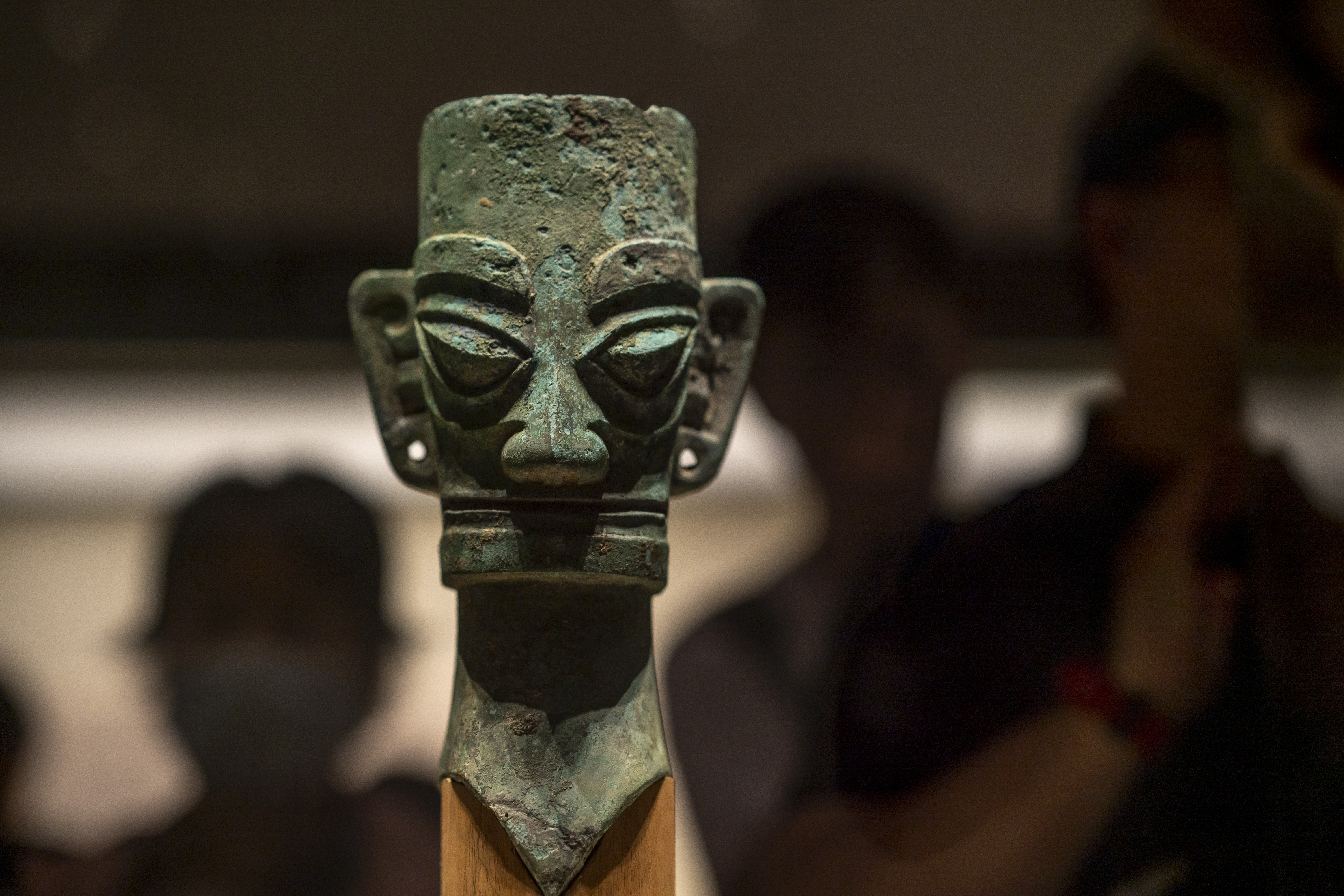 青銅人首,商后期文物,高37.5厘米,1986年四川廣漢三星堆出土。青銅人首神情嚴肅、詭秘,面部上寬下窄,呈倒梯形;寬眉,目呈杏核狀,眼角上挑,鼻翼上方似戴一面罩,闊口,兩耳飾卷云紋,耳垂有穿;腦后梳一長辮,發絲根根可見。此器出土于三星堆遺址祭祀坑中,與之同出的還有大量玉器、銅器等物,有許多明顯受到中原文化的影響,如銅尊、銅罍等。三星堆遺址一般被視為古蜀人的遺存。這些發現表明商與古蜀之間的交流十分密切。攝影郭莎莎/人民畫報