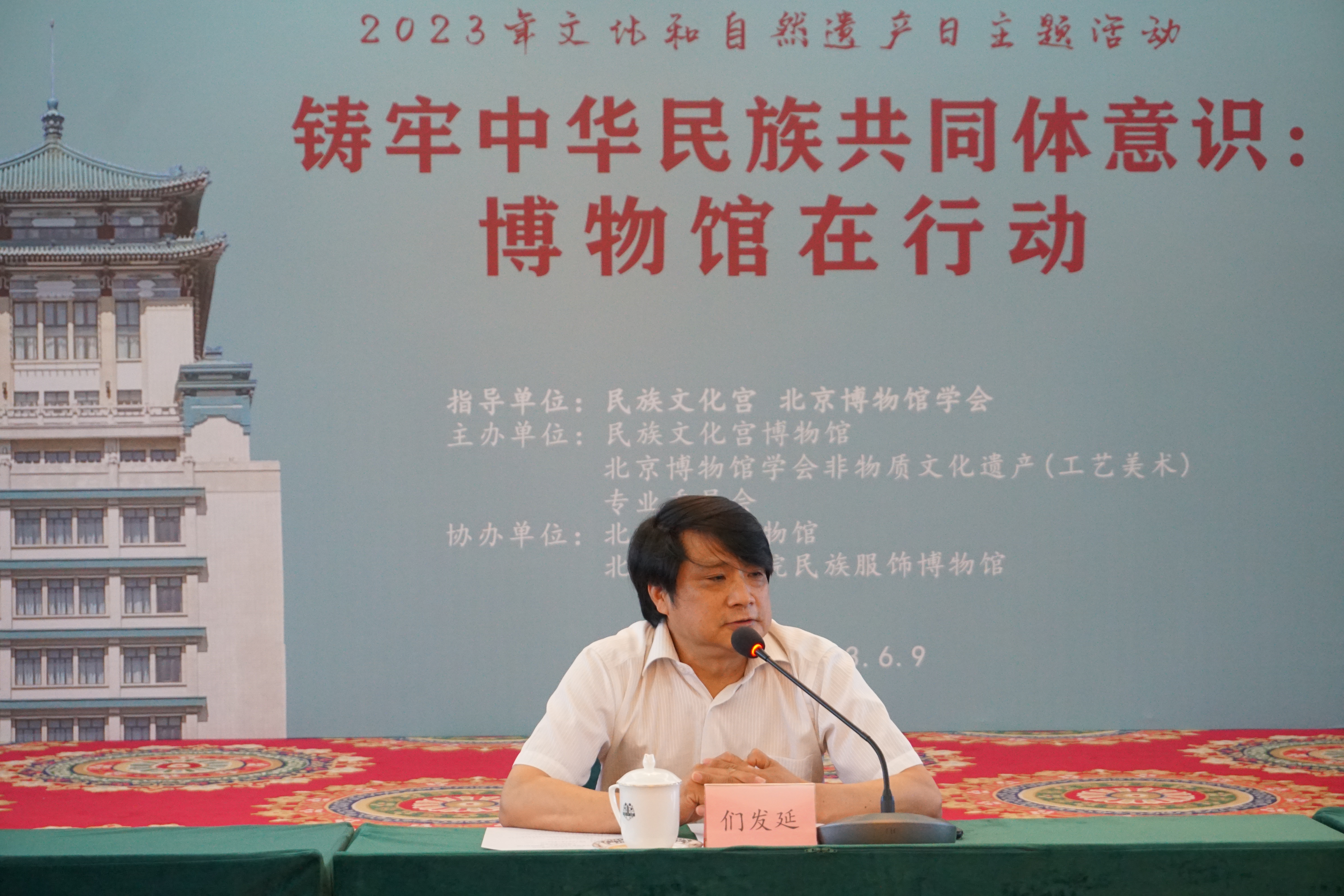 6月9日,“鑄牢中華民族共同體意識:博物館在行動”2023年文化和自然遺產日主題論壇在民族文化宮舉辦。本次活動由民族文化宮、北京博物館學會指導,民族文化宮博物館、北京博物館學會非物質文化遺產(工藝美術)專業委員會(以下簡稱北京博物館學會非遺專委會)主辦,北京藝術博物館、北京服裝學院民族服飾博物館協辦。來自民族文化宮、北京市民族宗教事務委員會、北京博物館學會非遺專委會、中央民族大學民族博物館、北京服裝學院民族服飾博物館、北京藝術博物館、北京文旺閣木作博物館等單位的領導和專家參加活動,就北京地區博物館在鑄牢中華民族共同體意識、促進各民族交往交流交融、構筑中華民族共有精神家園等方面的實踐與經驗等進行交流研討。全國政協委員,民族文化宮黨委委員、副主任們發延和北京博物館學會非遺專委會主任委員賀陽在論壇活動中致辭。北京市博物館學會常務理事、民族文化宮博物館館長陶穎和北京服裝學院民族服飾博物館館長田輝、北京藝術博物館副研究員李曄等作了主旨發言。會議由民族文化宮博物館副館長崔德志主持。