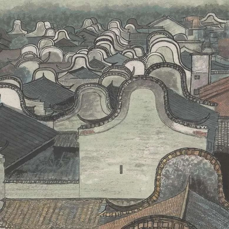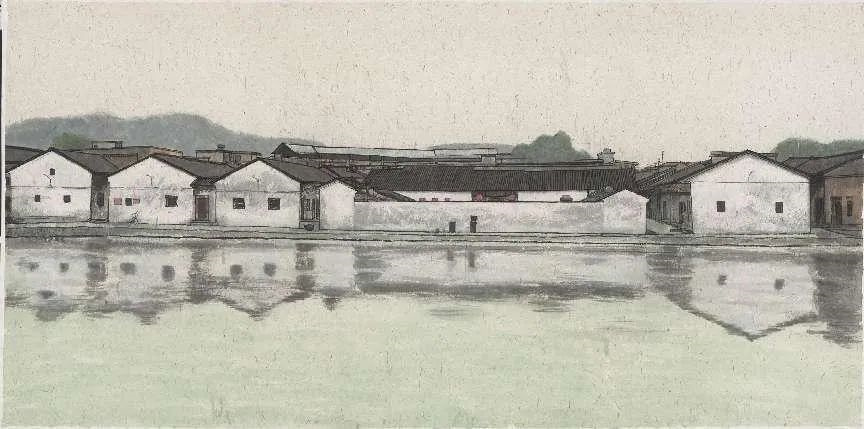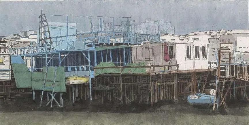 我想把這些景和物記錄下來,就用平常的視角,匆匆一瞥或回眸而視,極目眺望或細細打量,真實地記錄我看到的大灣區,表現自己感受到的風土人情。我想,這一切要像寫生一樣真實,還原物象最本真的狀態,從整體到局部,以繪畫意象呈現出來。在古老滄桑的牌樓背后有錯綜交織的電線天線,在巍峨莊重的墻面上布著斑駁的苔痕水跡,舊民居新樓房穿插并置,小漁船大貨輪遙相呼應,新與舊、古老和現代、城市與鄉村就這樣自然地交織在一起,不需要取舍,也不必回避,就用彩墨點染鋪陳它們本來的樣子,展現那一刻時空、景物、眼與心交匯的樣子。這是今天的大灣映現在我心里的樣子,就像白云投影在湖面,水流云動,是此時,也是永恒。
