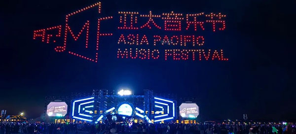 在氣氛最熱烈的時候,500架無人機緩緩升空,列隊表演,不斷變換陣型,時而在空中呈現出“亞太音樂節”、“中國外文局亞太傳播中心”、“太仆寺旗歡迎您”等巨幅字幕,時而呈現吉他、音符、蒙古包等色彩繽紛的圖案。