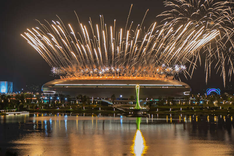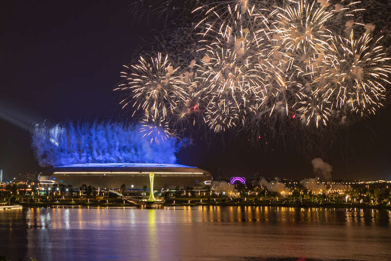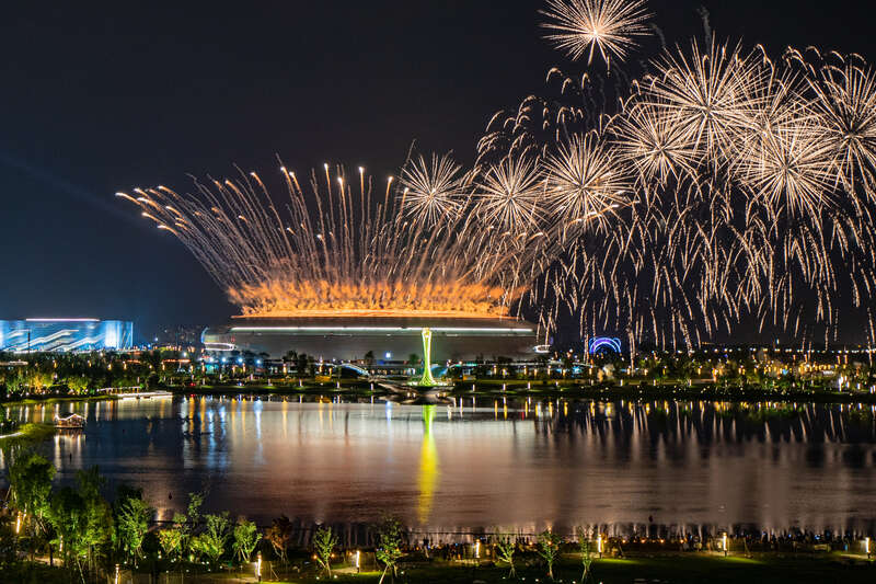中國青年報客戶端訊(汪龍華)近日,成都第31屆世界大學生夏季運動會舉行開幕式焰火彩排。成都大運會主火炬塔與焰火一起倒映在東安湖的水面上,照亮了夜空。