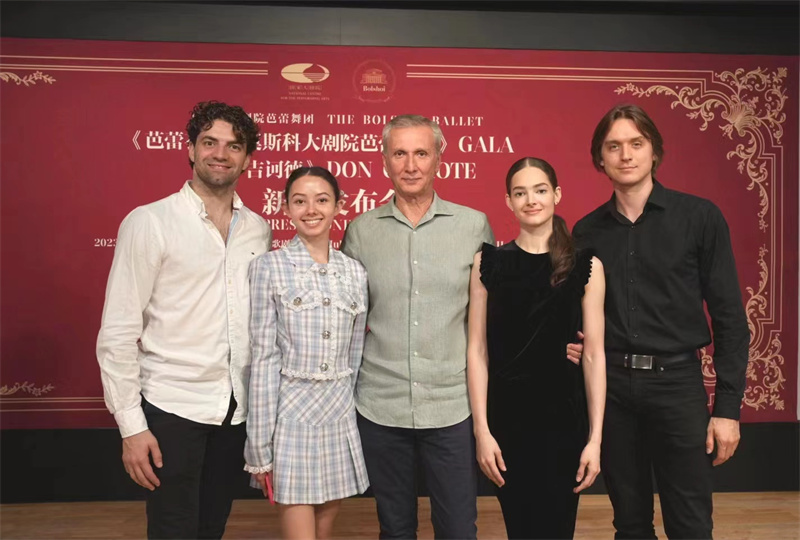 7月24日,莫斯科大劇院芭蕾舞團藝術總監馬哈爾·瓦齊耶夫,攜手舞團首席明星伊戈爾·茨維爾科、丹尼斯·羅德金、伊麗薩維塔·科科雷娃、埃莉奧諾拉·塞弗納德出席了新聞發布會。(國家大劇院供圖 攝影:王小京)