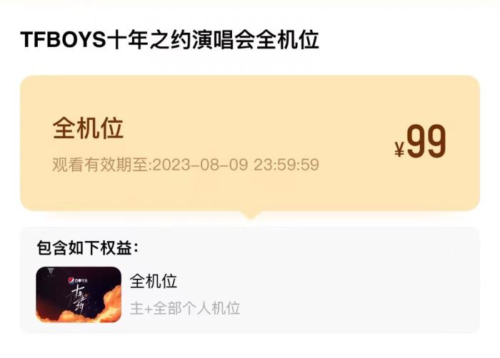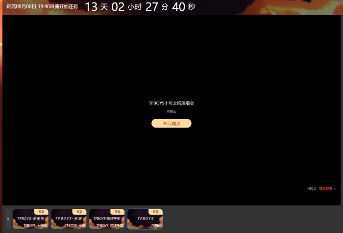 作為三個男孩出道十周年的紀念演出,演唱會的搶票大戰讓網友直呼“這陣仗從沒見過”。24日早間,有網友在社交媒體稱,就連優酷的線上直播票也需要搶,158元一張,還要優酷年VIP才有資格買,“優酷太黑了”。