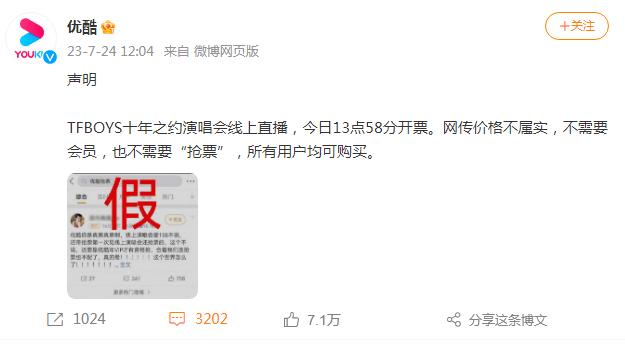 對此,優酷隨即也在官方微博回應稱,TFBOYS十年之約演唱會線上直播,網傳價格不屬實,不需要會員,也不需要“搶票”,所有用戶均可購買。