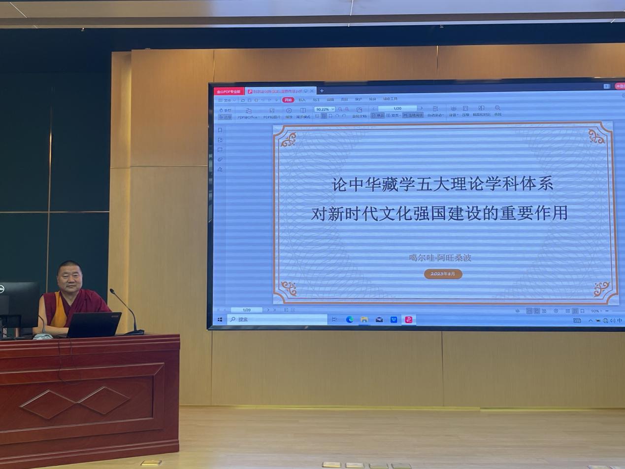 青海省因明學會會長噶爾哇?阿旺桑波在研討會上對中華藏學五大理論體系進行了深入剖析。他在論文《共生共榮——中華藏學五大理論體系助力文化強國與人類命運共同體構建》中闡釋了這些理論體系如何為文化強國建設和人類命運共同體構建提供了有力支持,并在研討會場上對其進行了簡要概述:
