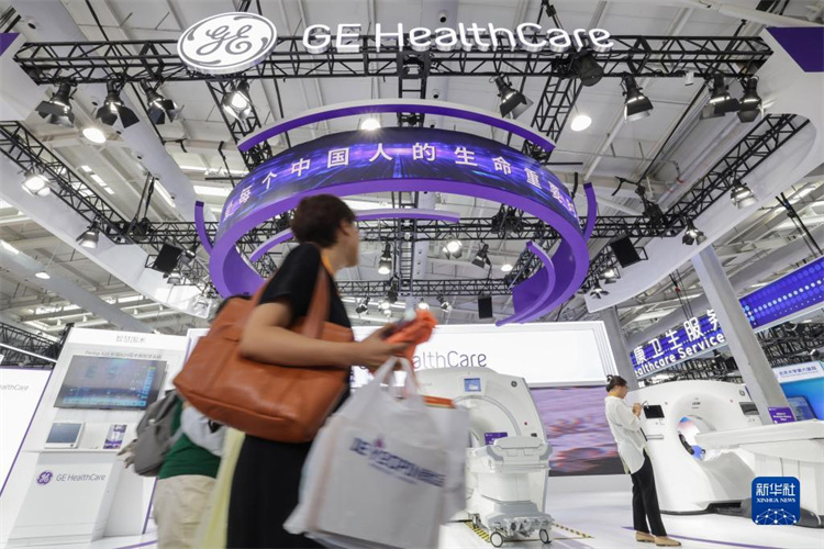 9月4日,參觀者走過服貿會首鋼園健康衛生服務展區的通用電氣醫療展臺。