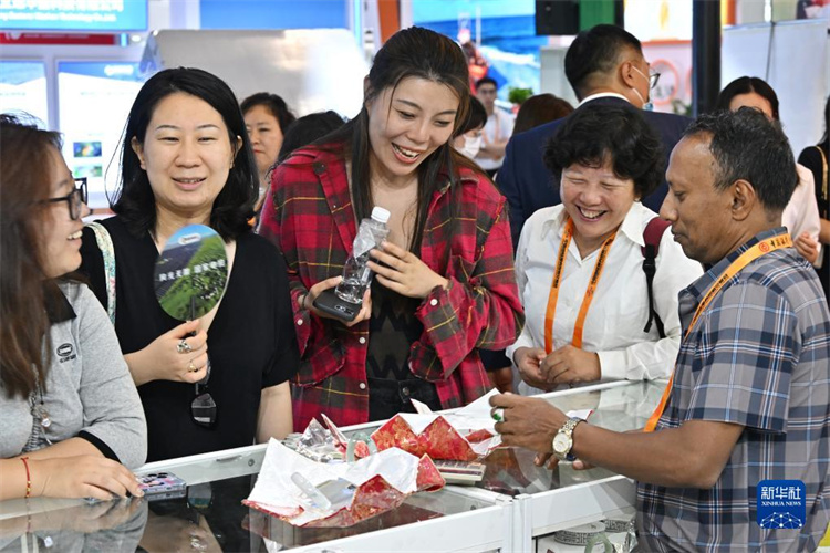 9月4日,參觀者在服貿會國家會議中心的緬甸展臺了解并挑選翡翠飾品。