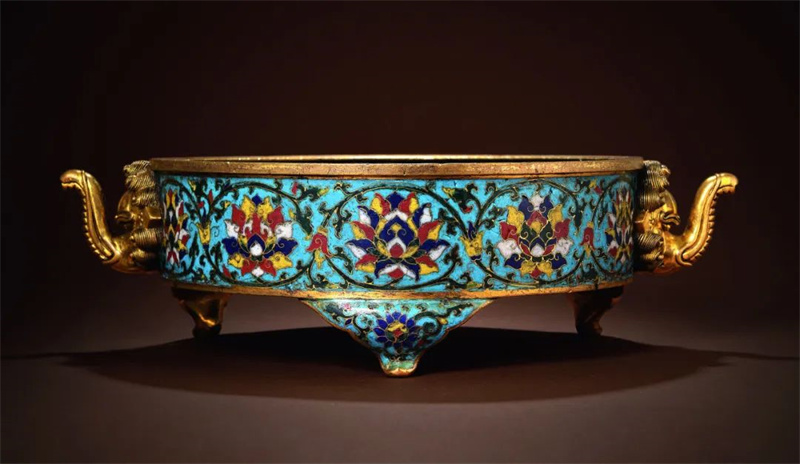“文物精品展”展品:御製銅胎掐絲琺瑯纏枝蓮紋雙象耳三足爐 明宣德 直徑36.4厘米 (北京市文物局供圖)