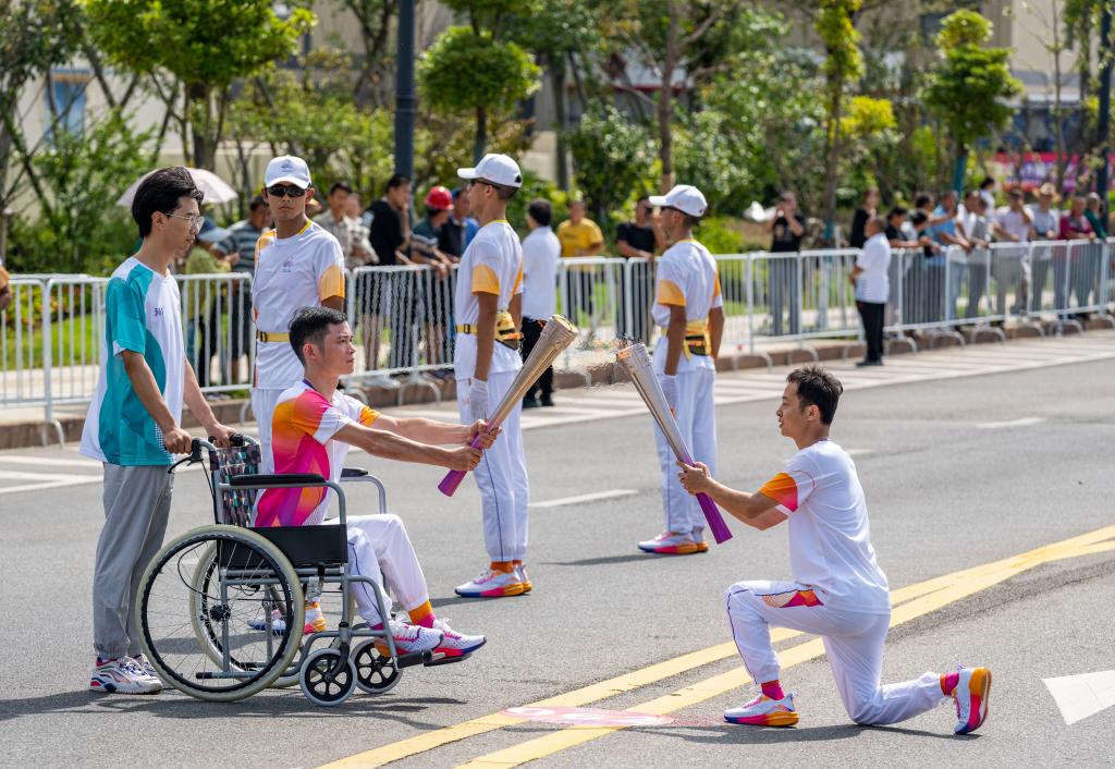 9月13日,火炬手張海斌(左)和賀云飛在火炬傳遞中。新華社記者 孫非 攝
