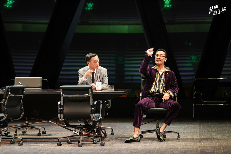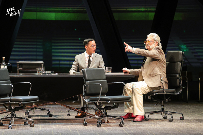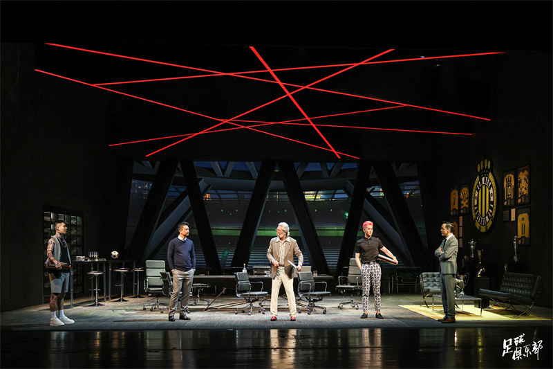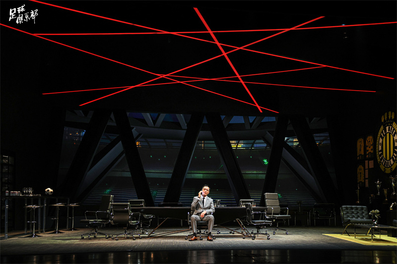 從小劇場進入大劇場,本劇的舞美也進行了較大的改版——現代化的綠茵場地,鋼架結構搭建起的會議室,讓舞臺上的空間既有壓迫感也充滿力量感。寫實的舞臺陳設、現代感的燈光、考究的人物服裝,在這樣一個看似不大的會議室里,既還原了真實的俱樂部場景,也為觀眾上演了一場火力十足的“較量”。