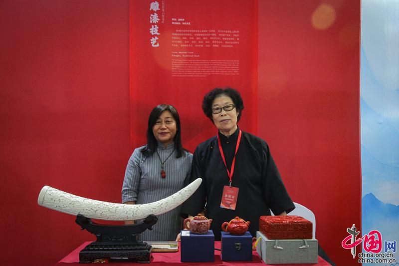 國家級非物質文化遺產“雕漆技藝”展位。圖為該非遺技藝傳承人殷秀云(右)與王慧茹(左)。