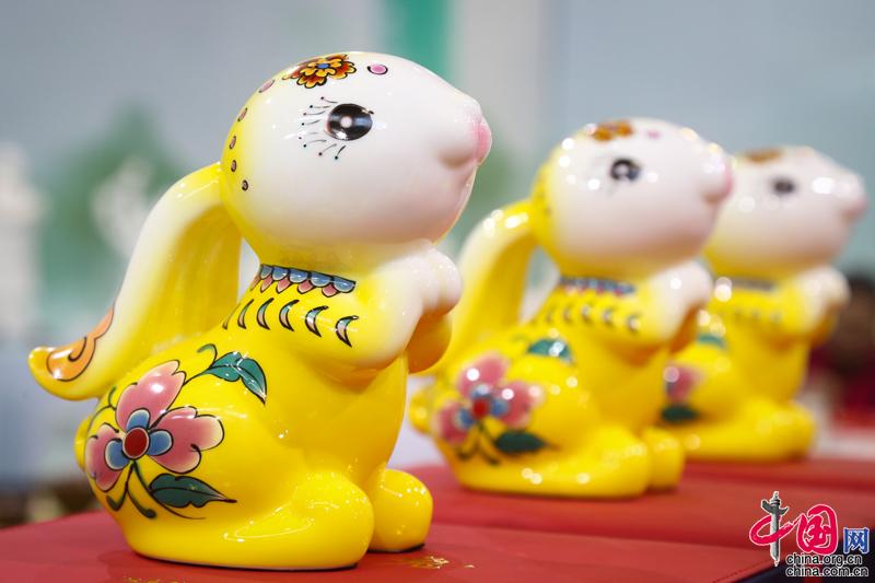 “茶和天下”福建展區-陶瓷雕塑《小喜兔》。中國網記者 鄭偉 攝