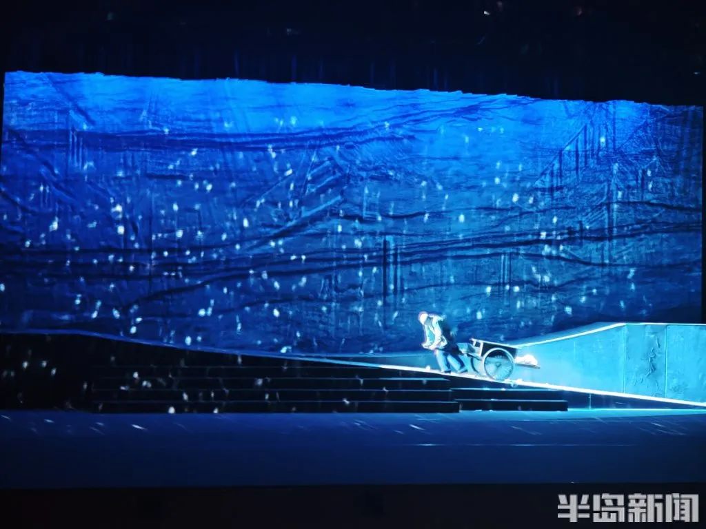 青島大學劇院演出現場。圖為劉謙初的父親劉祿從老家來到濟南將兒子遺體帶回家的場景。