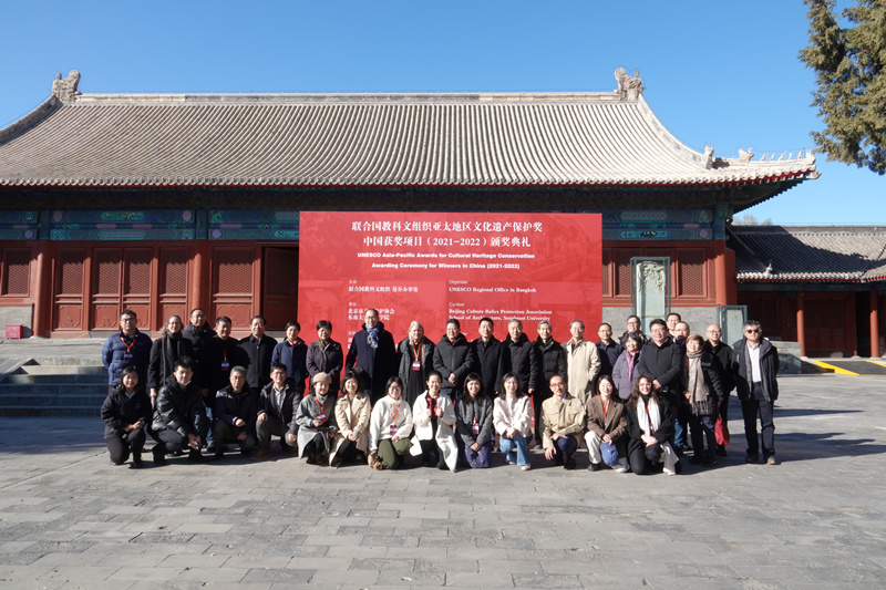 程建華、黃永光、任景峰及相關領導為2021、2022年度聯合國教科文組織亞太地區文化遺產保護獎中國獲獎項目進行頒獎,并同獲獎者合影留念。