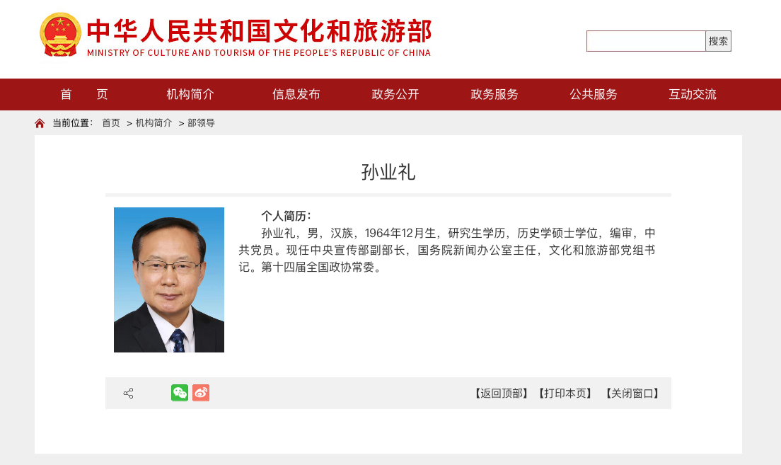 孫業禮,男,漢族,1964年12月生,研究生學歷,歷史學碩士學位,編審,中共黨員?,F任中央宣傳部副部長,國務院新聞辦公室主任,文化和旅游部黨組書記。第十四屆全國政協常委。