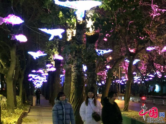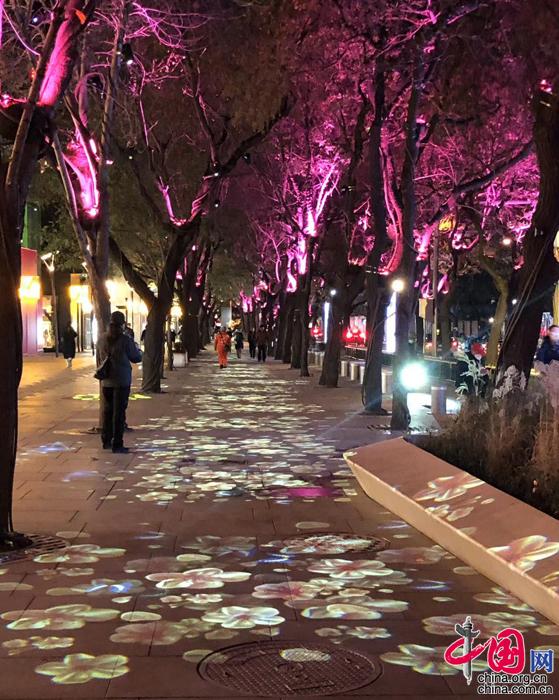 走在寬闊的步行區域,仿佛漫步在銀河之間:仰頭,多姿多彩的“繁星”懸在國槐樹梢,火樹銀花徐徐綻放;低頭,楓葉、桃花搖曳生姿,浪漫至極?;鸺t色的“鳳凰”在繁花中展翅飛舞,增添了一抹壯麗之美。在燈光“走廊”漫步之余,市民游客可以隨時停下腳步,到沿路的燈光景觀拍照打卡。
