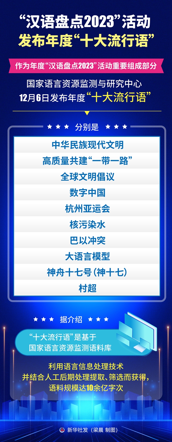 作為年度“漢語盤點2023”活動重要組成部分,國家語言資源監測與研究中心12月6日發布年度“十大流行語”,分別是:中華民族現代文明、高質量共建“一帶一路”、全球文明倡議、數字中國、杭州亞運會、核污染水、巴以沖突、大語言模型、神舟十七號(神十七)、村超。