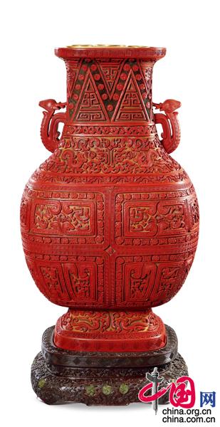 清乾隆 剔彩夔鳳獸面紋雙鹿耳大壺(附清宮原裝銅鏨刻花膽)