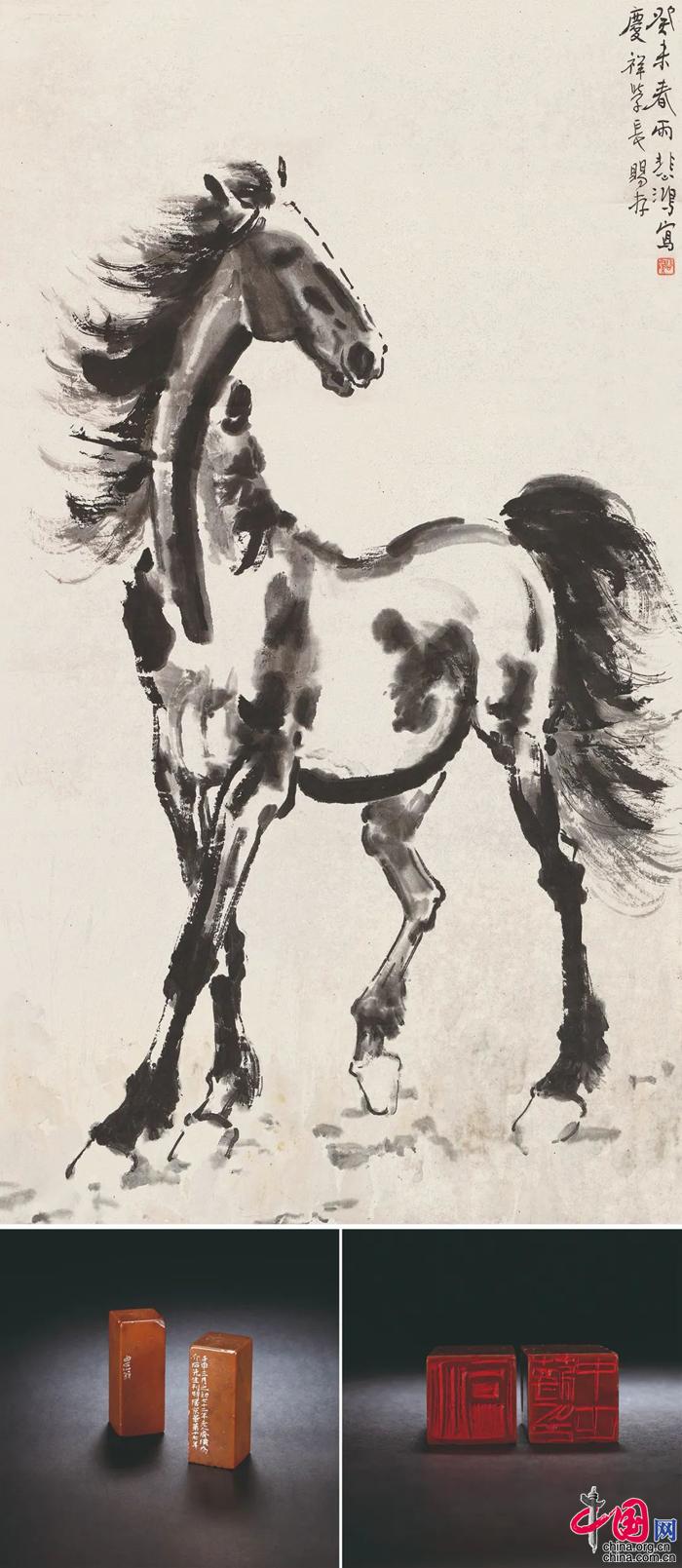 中國書畫呈獻諸多大師名家力作佳構,包括傅抱石家藏《九老圖》,尺幅近十平尺,圖繪了九位老者、四位侍童于茂林間吟詩屬文的場景。圖中九位老者或立或坐,四位侍童點綴穿插其間,整幅畫作給人以繁而不雜、緊而有序的觀感,意趣洋溢。1941年《云臺山記圖卷及設計稿》,為傅抱石山水畫轉變時期最重要畫作。徐悲鴻畫贈蔣介石侍從秘書毛慶祥的《立馬》及毛慶祥珍藏的齊白石刻贈蔣介石的一對印章,非常難得。此外,張大千《空行母像》、栗秀真珍藏的齊白石《松鷹圖》《桃花雙鳥》、林風眠《繁花群鳥》等亦十分精彩。