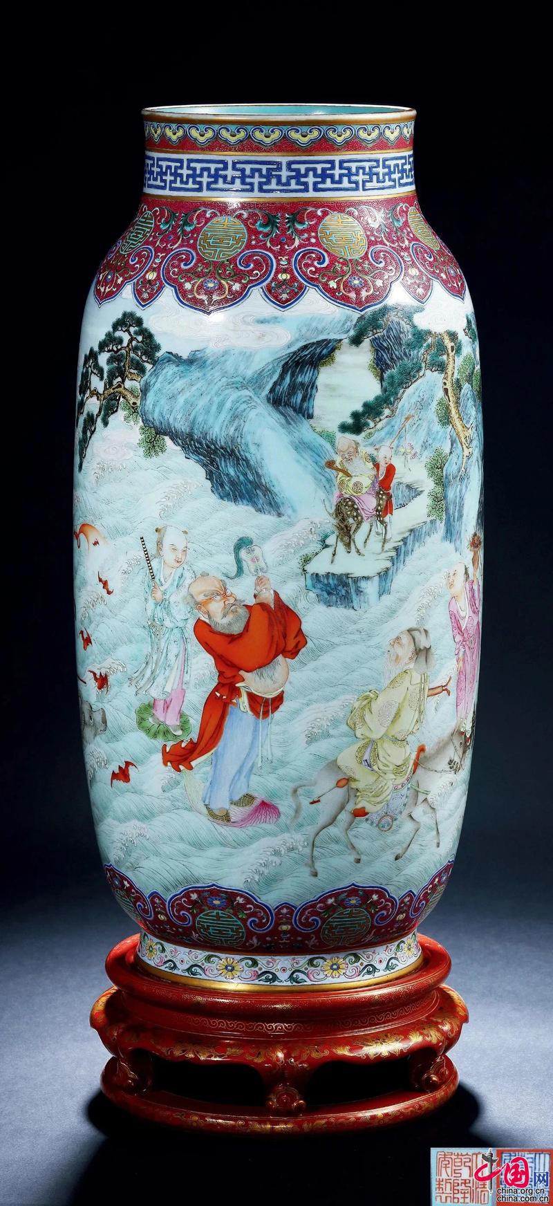 清乾隆 御制洋彩胭脂紅地軋道通景“八仙慶壽”江山一統尊(連珊瑚紅描金彩瓷座)“大清乾隆年制”款