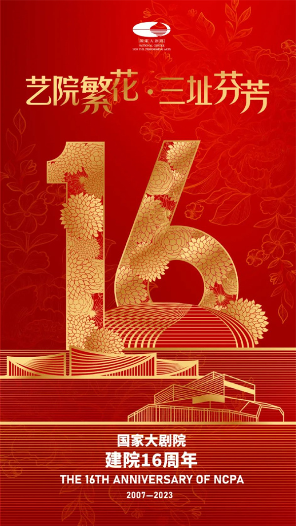 位于長安街畔的大劇院外火樹銀花,北水下廊道布滿印有2007至2023數字和演出精彩瞬間的紅色垂幔,配上大紅燈籠,腳下2007至2023的數字,象征著國家大劇院已經走過的16載春秋。兩側布置了國家大劇院“一院三址”16周年紅底海報,銅門處“一院三址”16周年的背板以及歌劇院環廊外“16”的字樣增添了周年氛圍。