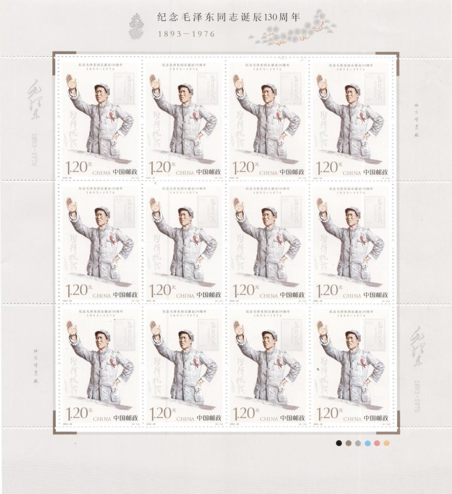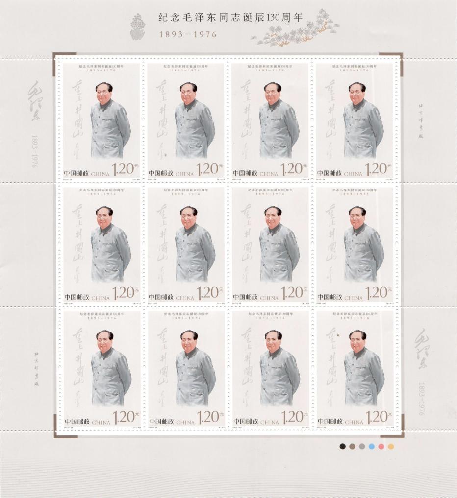 新華社北京12月25日電 中國郵政定于12月26日發行《紀念毛澤東同志誕辰130周年》紀念郵票1套4枚,郵票圖案名稱分別為堅持抗戰、建設十三陵水庫、胸懷天下、重上井岡山。