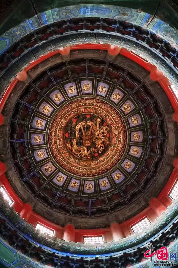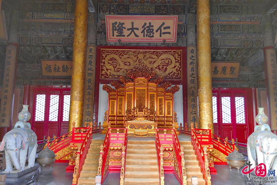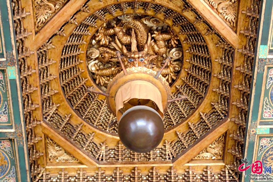 殿中四根瀝粉貼金蟠龍柱,頂置八角渾金蟠龍藻井,下設寶座,品級僅次于太和殿。(中國網發 蘆森寶攝)