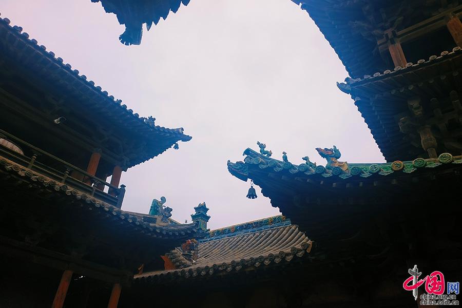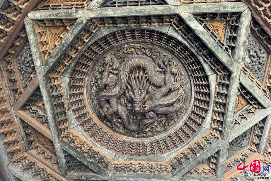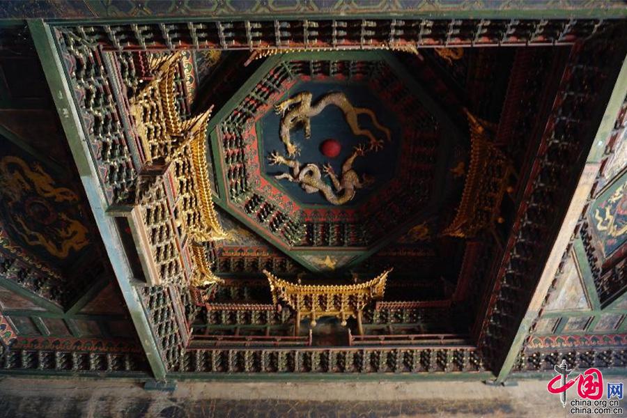 寺中主殿的中央藻井,被稱為“八門九星之天宮樓閣”,在方形藻井里又嵌入八角形藻井,下飾天宮樓閣,藻心為二龍戲珠,營造出一方華麗又神秘的空間。(中國網發 許凱章攝)